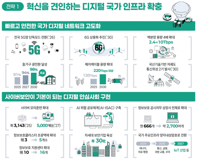 정보보호 관리체계를 강화하고 공공과 민간 사이버보안 역량 강화를 위한 제도 개선을 추진하는 등 사이버 위협으로부터 안전한 디지털 안심사회를 구현한다. 또 국가 데이터 통합 플랫폼을 구축해 고품질 데이터 생태계를 조성한다.
