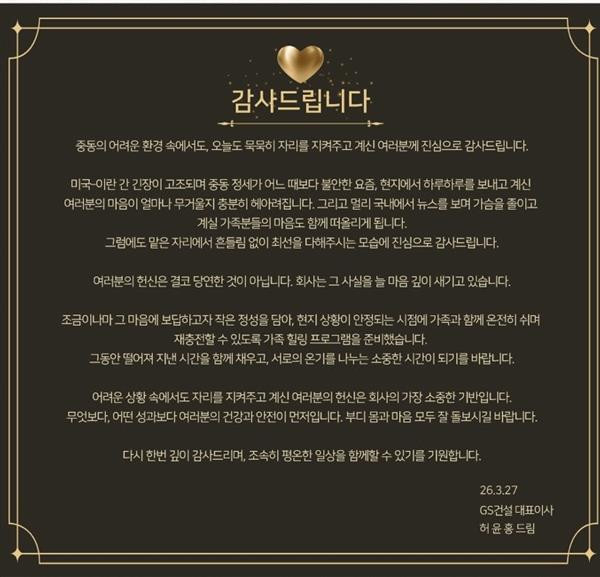 허윤홍 GS건설 대표가 중동 현장에 남은 임직원에 보낸 메시지[GS건설 제공][GS건설 제공]GS건설이 위험한 중동 정세 속에서도 현장에 근무하는 임직원들을 위한 특급 대우를 예고했습니다.