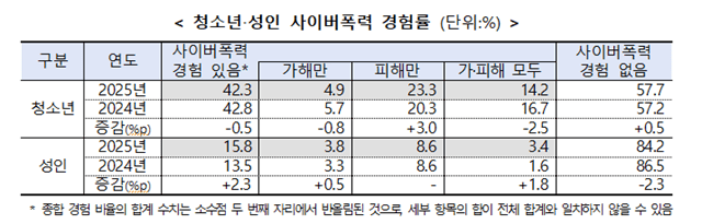 30일 방송미디어통신위원회와 한국지능정보사회진흥원은이 발표한 ‘2025년도 사이버폭력 실태조사 결과’에 따르면, 우리나라 청소년 42.3%, 성인 15.8%가 가해, 피해, 가피해 모두 등 사이버폭력을 경험한 것으로 집계됐다.
