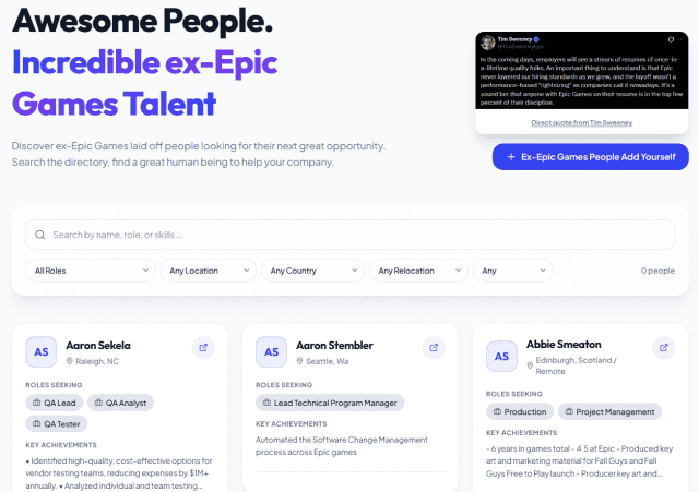 30일(현지시간) 게임인더스트리에 따르면 에픽게임즈는 해고된 1000여 명의 노동자를 돕기 위해 이들의 명단을 검색 가능한 데이터베이스 웹사이트를 공개했다.