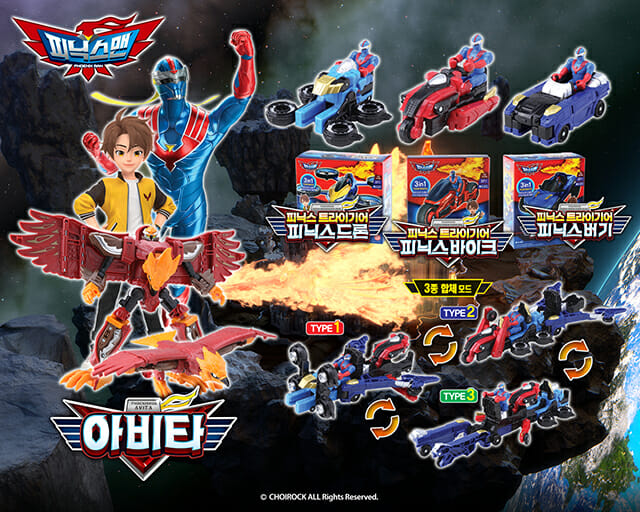 초이락컨텐츠컴퍼니(대표 최종일)는 ‘피닉스맨’ 주인공의 수호정령인 불새 ‘아비타’와, 드론을 포함한 ‘트라이기어’ 완구 3종 세트를 출시했다고 3일 밝혔다.