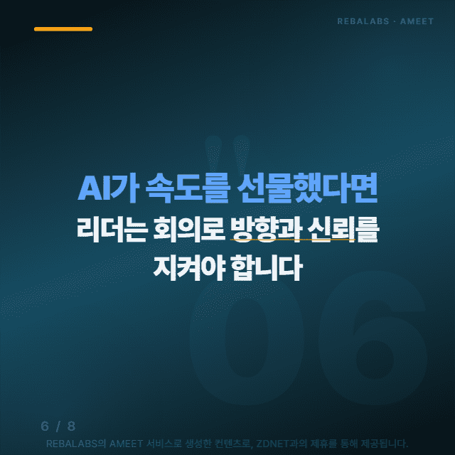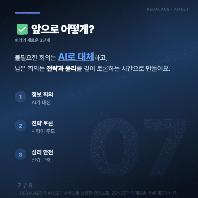 AI가 속도를 선물했다면, 리더는 회의로 방향과 신뢰를 지켜야 합니다. 앞으로는 불필요한 정보 공유 회의는 AI로 대체하고, 남은 회의는 전략과 윤리를 깊이 토론하는 시간으로 만들어야 해요.