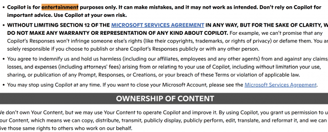 5일(현지시간) PC맥 등 외신에 따르면 마이크로소프트는 코파일럿 이용 약관에서 해당 서비스를 오락용으로 규정한 것으로 확인됐다. 이용자가 코파일럿에 지나치게 의존하지 말라는 당부가 포함됐다. 해당 약관은 지난해 10월 24일 업데이트된 것으로 나타났다.