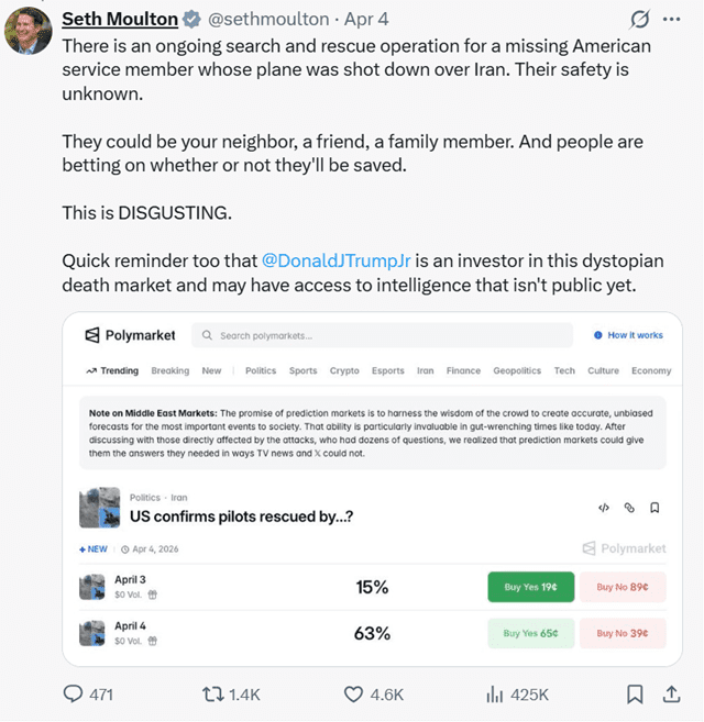 몰튼 의원은 폴리마켓 사과에 대해 “회사의 공정성 기준이 심각하게 부족하다”고 비판하며 다른 전쟁 관련 베팅을 지적했다.