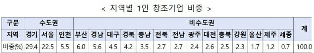 지역별 1인 창조기업 비중은 경기 29.4%(34.2만개), 서울 22.5%(26.2만개), 부산 6.0%(7만개), 경남 5.6%(6.5만개), 인천 5.5%(6.4만개) 순으로 나타났다. 수도권이 57.5%(66.8만개), 비수도권이 42.5%(49.4만개)를 차지했다.