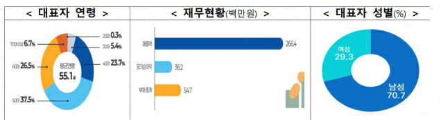 대표자 연령은 평균 55.1세, 성별은 남성 70.7%, 여성 29.3%로 조사됐다. 기업당 평균 매출액은 2억6640만원, 당기순이익은 3620만원으로 집계됐다.