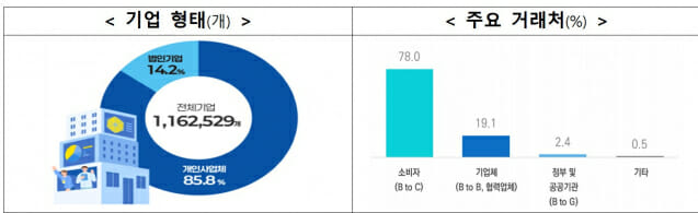 기업형태는 법인기업(14.2%)보다 개인사업체(85.8%)가 비중이 높았다. 주요 거래처는 ‘개인 소비자(BtoC)’가 78.0%로 가장 높았다. 이어 기업체(BtoB) 19.1%, 정부·공공기관(BtoG) 2.4% 순으로 나타났다.