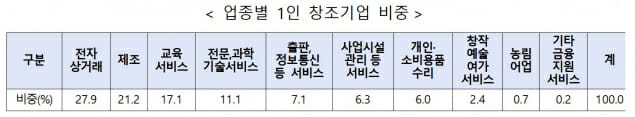 업종별 1인 창조기업 비중은 전자상거래업(27.9%), 제조업(21.2%), 교육서비스업(17.1%) 순으로 3개 업종 비중이 66.2%에 달했다.