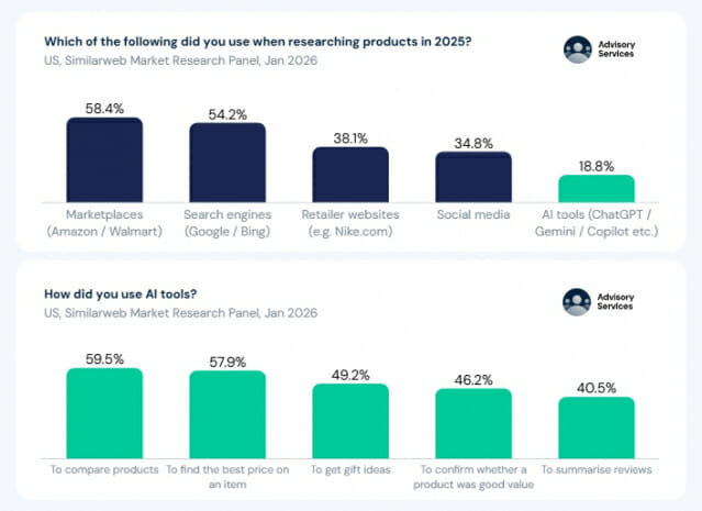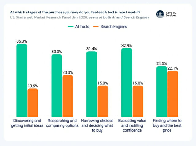 소비자가 새로운 상품을 발견하는 첫 단계에서 AI 도구는 이미 구글 검색을 압도하고 있다. 시밀러웹의 2026년 1월 미국 소비자 패널 조사에 따르면, 상품 발견 단계에서 AI 도구를 사용하는 소비자 비율은 35%인 반면 검색 엔진은 13.6%에 그쳤다. AI는 발견부터 평가단계까지 검색 대비 1.5배 이상의 우위를 점했으며, 최종 구매처를 찾는 마지막 단계에서만 두 채널의 격차가 거의 사라졌다.