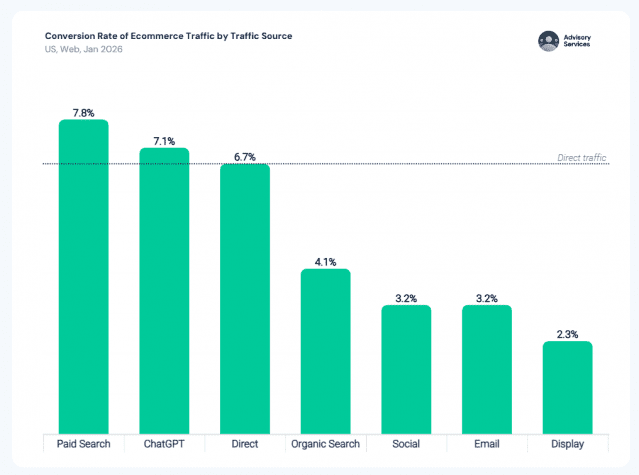 2026년 1월 기준 이커머스 트래픽 전환 소스_직접 방문보다 챗GPT가 더 높게 나타남