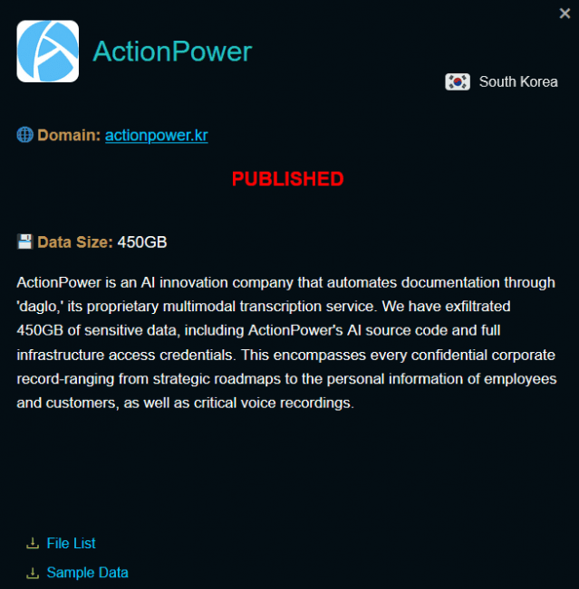 크립토24는 “액션파워의 AI 소스코드와 전체 인프라에 접근할 수 있는 액세스 자격 증명을 포함해 450GB의 민감 데이터를 유출했다”며 “유출한 데이터에는 전략 로드맵부터 직원 및 고객의 개인정보, 음성 녹음 등에 이르기까지 모든 기밀 기업 기록이 포함돼 있다”고 주장했다.