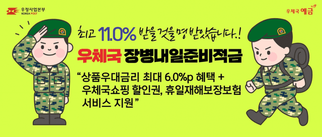 우정사업본부는 국방의 의무를 수행 중인 장병들의 안정적인 사회복귀를 돕기 위해 ‘우체국 장병내일준비적금’의 금리를 최대 연 11%로 확대하는 등 금융 혜택을 대폭 강화했다고 9일 밝혔다.