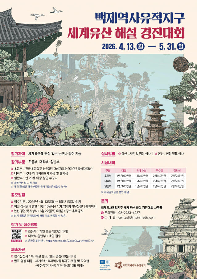 백제세계유산센터는 “이번 경진대회는 단순한 발표 대회를 넘어, 세계유산을 스스로 이해하고 자신의 언어로 풀어내는 의미 있는 경험이 될 것”이라며 “많은 국민들이 참여해 백제역사유적지구의 세계유산적 가치와 매력을 함께 나누는 계기가 되길 바란다”고 전했다.