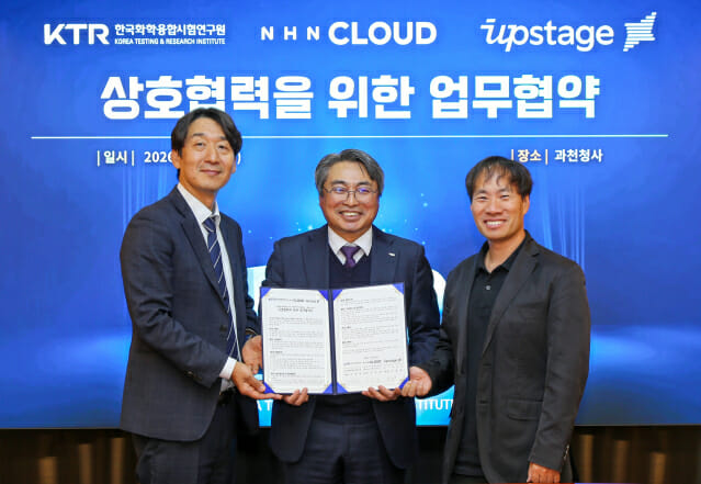 KTR(한국화학융합시험연구원·원장 김현철)은 13일 업스테이지·NHN클라우드와 업무협약을 체결, 인공지능(AI) 인프라·서비스에 시험인증을 결합하는 협력체계를 구축했다고 밝혔다.