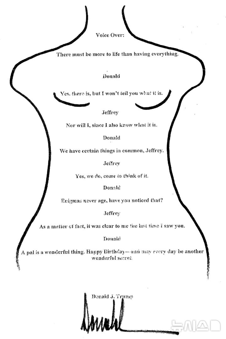 서한은 굵은 마커로 그린 여성의 나체 프레임 안에 손 글씨로 내용을 쓴 형태다. 여성의 가슴 부위가 곡선으로 표시되고, ‘도널드’라는 서명이 중요 부위 윗부분에 쓰여 체모를 암시하는 것처럼 보였다고 WSJ은 전했다.