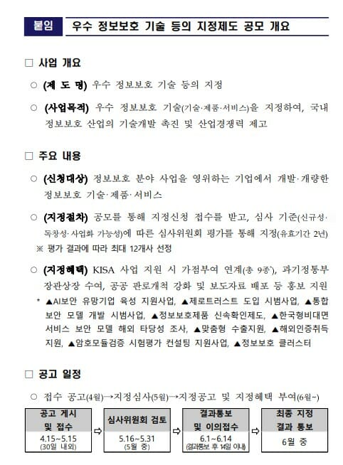 과학기술정보통신부(과기정통부)와 한국인터넷진흥원(KISA)은 정보보호 분야의 경쟁력 확보 및 시장 활성화를 위해 우수한 기술·제품·서비스 지정 대상을 이달 15일부터 다음달 15일까지 모집한다고 밝혔다