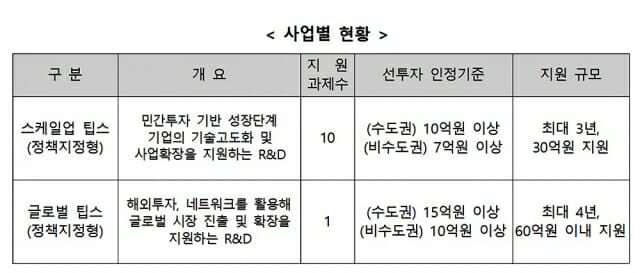 보건복지부는 본격적인 성장단계의 중소벤처기업을 지원하는 스케일업 팁스(10개 과제 선정, 최대 3년간 과제당 30억원 지원)와 해외 시장 진출을 지원하는 글로벌 팁스(1개 과제 선정, 최대 4년간 60억원 이내 연구개발비 지원) 등 2개 분야 11개 과제를 추천할 예정이다.