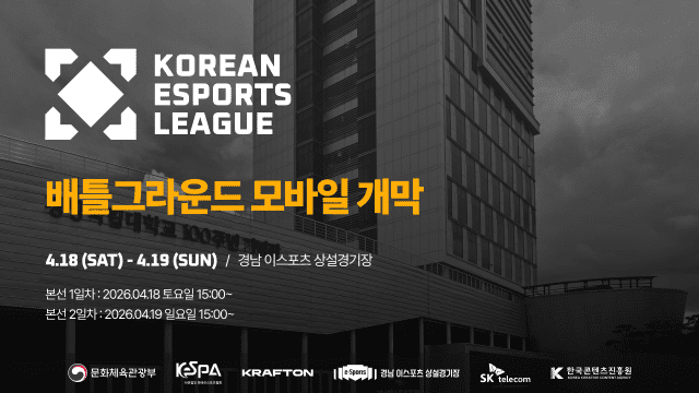 한편 2026 KEL 배틀그라운드 모바일 종목 개막전은 문화체육관광부가 주최하고 한국e스포츠협회와 크래프톤이 공동 주관한다. 경남 이스포츠 상설경기장, SK텔레콤, 한국콘텐츠진흥원이 후원한다.