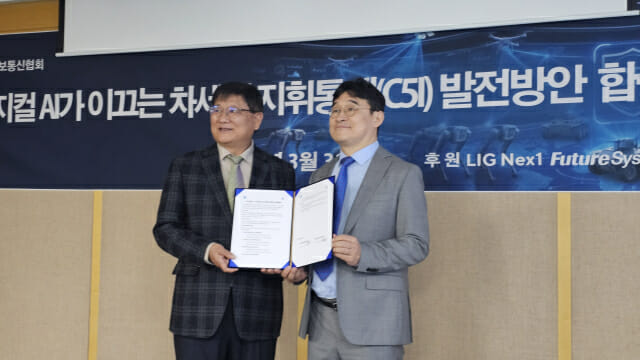 유태준 한국피지컬AI협회장(오른쪽)이 이신의섭 국방정보통신협회 회장과 협력을 위한 MOU를 맺고 있다. (사진=지디넷코리아 DB)