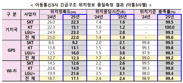 2025년도 품질측정 결과 전년도 대비 이동통신 3사의 ‘기지국’ 방식 위치정확도는 25.0m에서 22.0m로 개선됐으나 응답시간은 1.4초에서 1.9초로 다소 늘어났다. 위치기준 충족률은 99.6%다.