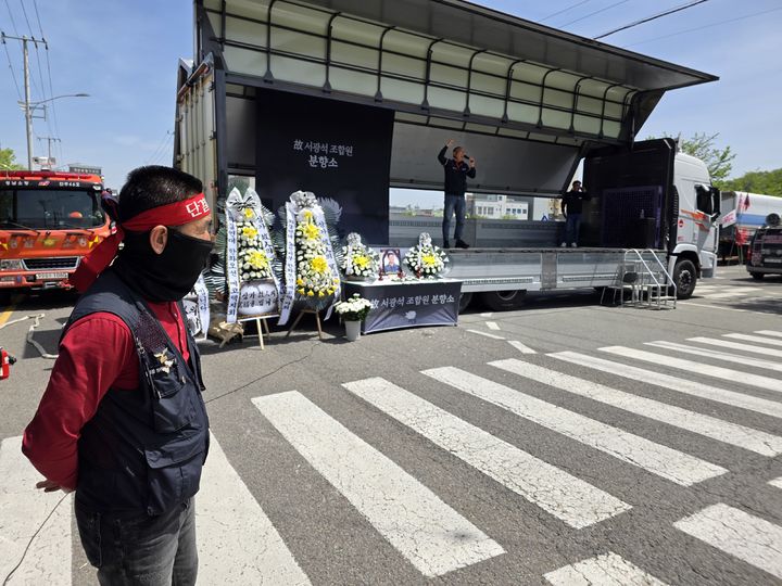 [진주=뉴시스] 정경규 기자 = 화물연대본부는 지난 20일 물류차량이 출차하는 과정에서 목숨을 잃은 고(故) 서광석 조합원을 추모하는 분향소를 차렸다고 21일 밝혔다.