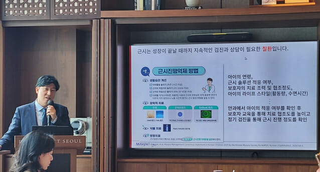이 자리에서 서영우 고대구로병원 안과 교수는 ‘한국형 근시 가이드라인’을 주제로 한 발표를 통해 “원시 상태에서 태어나 아이가 성장하며 눈이 점점 커져 정시가 된다. 문제는 여기서 더 커져 근시가 되는 것”이라며 “눈이 커지면 작아질 수 없다. 근시는 아이가 성장하면서 계속 진행되기 때문에 계속 눈이 커지지 않도록 개입하는 것이 치료의 목표이다”라고 말했다.