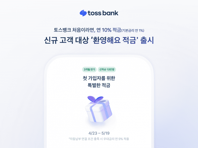 토스뱅크를 처음 찾는 고객에게 최대 연 10% 금리 혜택을 제공하는 ‘환영해요 적금’을 출시했다고 24일 밝혔다.