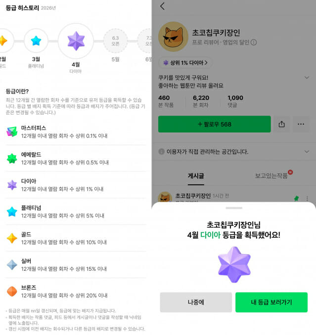 배지는 ▲마스터피스(상위 0.1%) ▲에메랄드(0.5%) ▲다이아(1%) ▲플래티넘(5%) ▲골드(10%) ▲실버(15%) ▲브론즈(20%) 등 총 7단계로 구성된다. 활동성이 높은 독자일수록 상위 배지를 획득하게 된다.