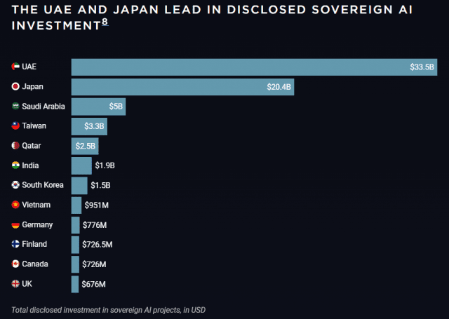 아랍에미리트(UAE)와 일본이 전 세계적으로 공개된 ‘소버린(주권) 인공지능(AI)’ 투자의 3분의 2 이상을 차지하는 것으로 나타났다. 소수 국가가 국가적 차원의 대규모 베팅을 통해 AI 자국화와 기술 주권 확보를 주도함을 보여준다는 평가다.