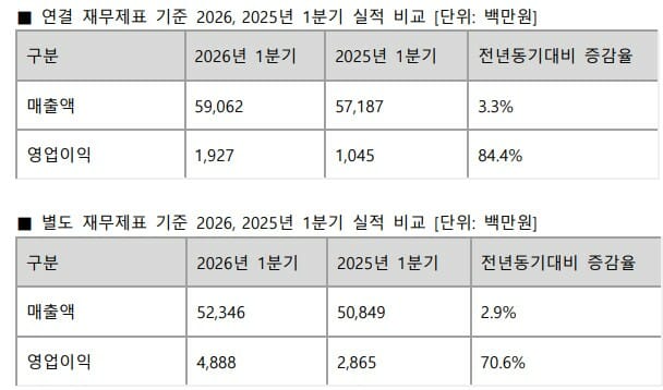 전년 동기대비 연결 기준 매출은 19억원(3.3%), 영업이익은 9억원(84.4%) 증가했다. 별도 재무제표 기준으로는 전년 동기 대비 매출이 15억원(2.9%), 영업이익은 20억원(70.6%) 각각 늘었다.