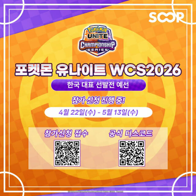SOOP(각자 대표이사 최영우·이민원)은 글로벌 이스포츠 대회 ‘포켓몬 월드 챔피언십 2026′(이하 WCS 2026)의 ‘포켓몬 유나이트’ 부문 한국 대표 선발전 예선을 생중계한다고 27일 밝혔다. 이번 대회는 주식회사 포켓몬이 주최한다.