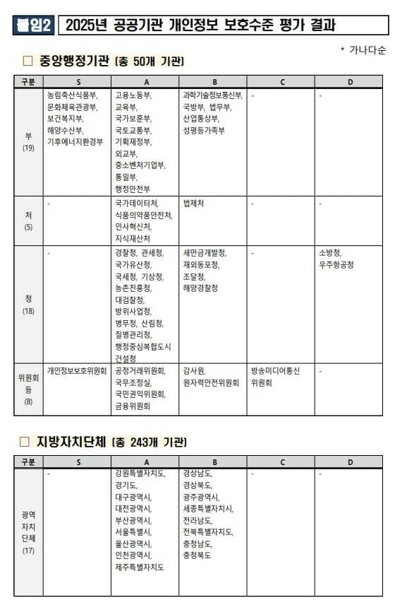 개인정보보호위원회(개인정보위)가 중앙부처·지자체·공기업 등 총 1442개 공공기관을 대상으로 실시한 ‘2025년 공공기관 개인정보 보호수준 평가’ 결과, 54개 기관(6.6%)이 최고 등급을 획득했다.