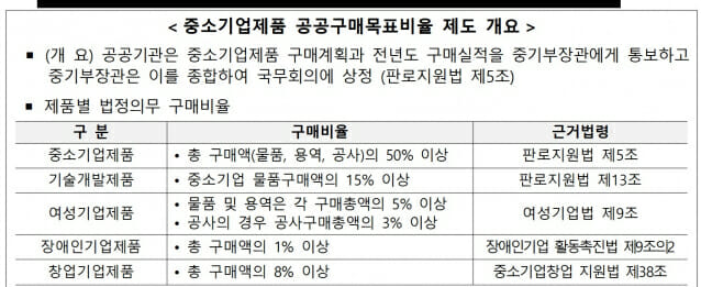 28일 중기부는 이날 열린 국무회의에서 이 같은 내용을 보고했다. ‘중소기업제품 구매촉진 및 판로지원에 관한 법률(이하 판로지원법)’ 제5조에 따라 847개 공공기관(국가기관, 지자체, 교육청, 공기업, 지방의료원 등)은 총 구매액의 50% 이상을 중소기업제품으로 구매해야 한다.