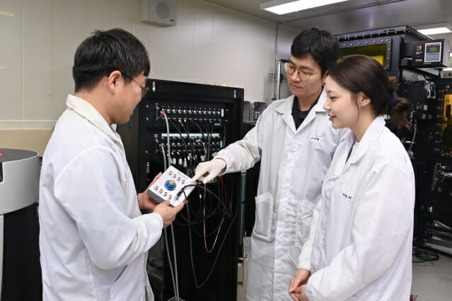 ETRI 연구팀(왼쪽부터 황태하, 조대형, 이수지 연구원)이 양자물질을 적용한 소재와 소자를 개발했다. 소자 성능을 측정 중인 연구진.(사진=ETRI)