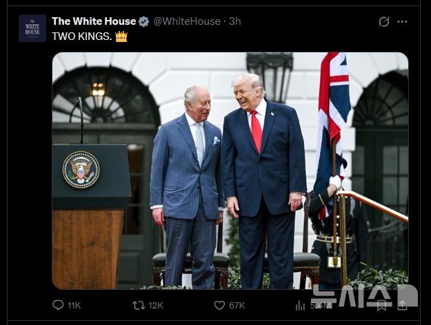 백악관은 이날 엑스(X·옛 트위터) 공식 계정에 트럼프 대통령과 찰스 3세가 백악관에서 회동하는 사진을 게재했다. 이 사진에는 “TWO KINGS(두 왕)”이라는 문구와 왕관 모양 이모티콘이 달렸다.