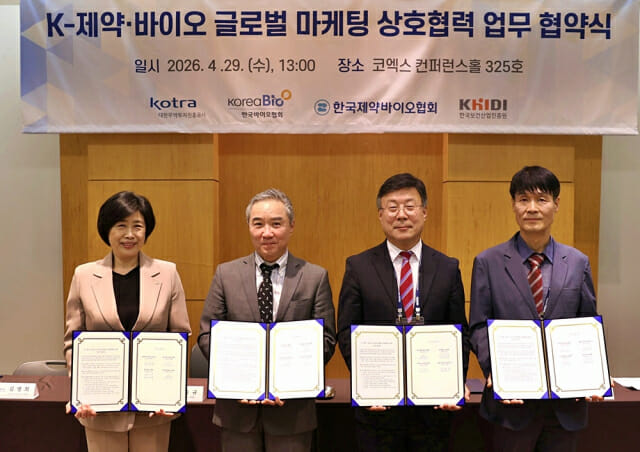 한국보건산업진흥원, 한국제약바이오협회, 한국바이오협회, 대한무역투자진흥공사(KOTRA)는 지난 29일 서울 코엑스에서 K-제약바이오 글로벌 마케팅 상호협력을 위한 업무협약(MOU)을 체결했다.